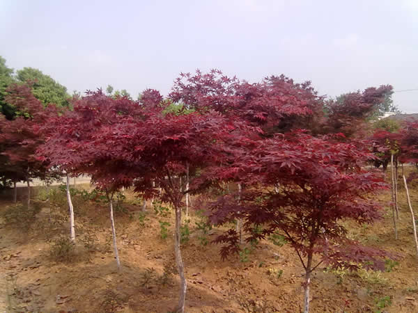 日本紅楓:又名日本紅絲帶。被譽為"四季火焰楓"。日本紅楓屬于槭樹科,落葉小喬木或灌木。它的樹冠呈扁圓或傘形,掌狀5-7深裂,卵狀披針形,單葉互生,葉片先端尖銳,葉緣有鋸齒。此品種在春、夏、秋三季葉片均為紅色,個別品種顏色非常艷麗。夏季隨著光照的增強葉體光合作用隨之增強,逐漸有變綠的趨勢.效果已經不如春季,秋季的時候新葉能夠保持紅色,但已經發暗,老葉已經變成墨綠色。日本紅楓樹種較小.一般用做景觀綠化用。